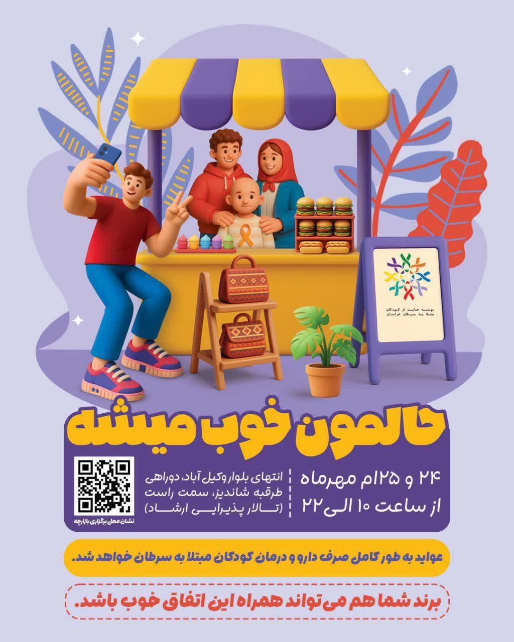 بازارچه‌ای با عنوان ” حالمون خوب میشه ” از سوی موسسه حمایت از کودکان مبتلا به سرطان خراسان ، در مشهد برپا می‌شود.